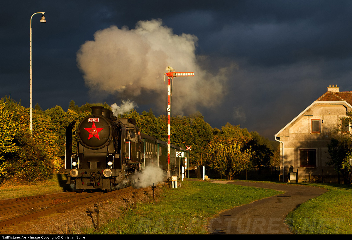 This was a really bad weather day. We had no sunshine the whole day. But suddenly for the last photo we planned for our photo train for this day the sun came out only for a few minutes. What a final shot! The steam engine 464.102, the old semaphore signal and the dark clouds in the background at Butoves station saved our day.