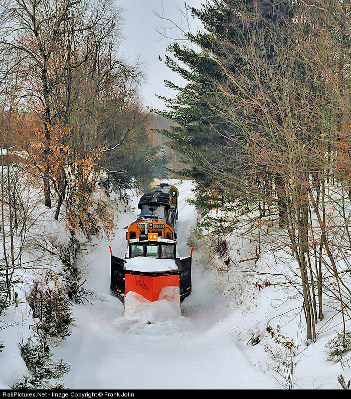 Plow extra lead by VB 101 ex CP plow and pushed by a pair of GE C30-7's heading for Megantic Quebec after an overnight snow storm.