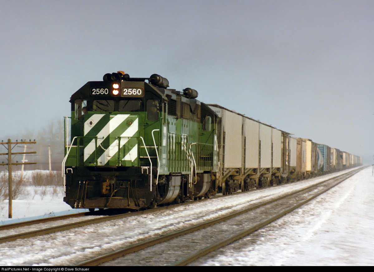 | We loved the variety when BN assigned a number of freshly painted former Frisco GP35s to Superior. They were easy to spot with top-mounted air tanks that allowed for larger fuel tanks. Unfortunately they didn't last more than a year or two before being shipped elsewhere. Here a pair lead a Superior to Grand Forks train. |