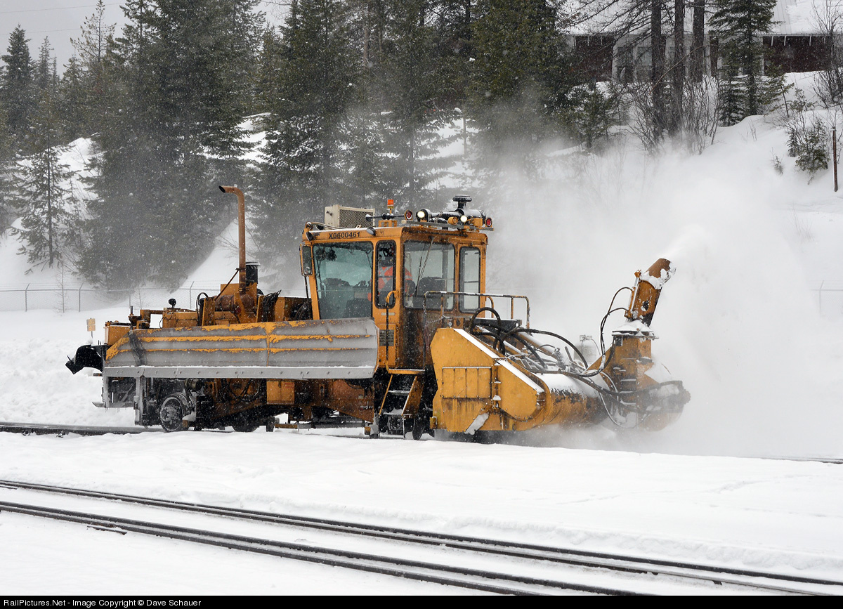 Clearing snow is a never-ending winter struggle on Marias Pass, especially this year. Here a "mini-dozer" (ballast regulator) clears a yard track at Essex. This machine has a neat attachment to its broom housing that allows snow to be thrown to the side like a snow blower.