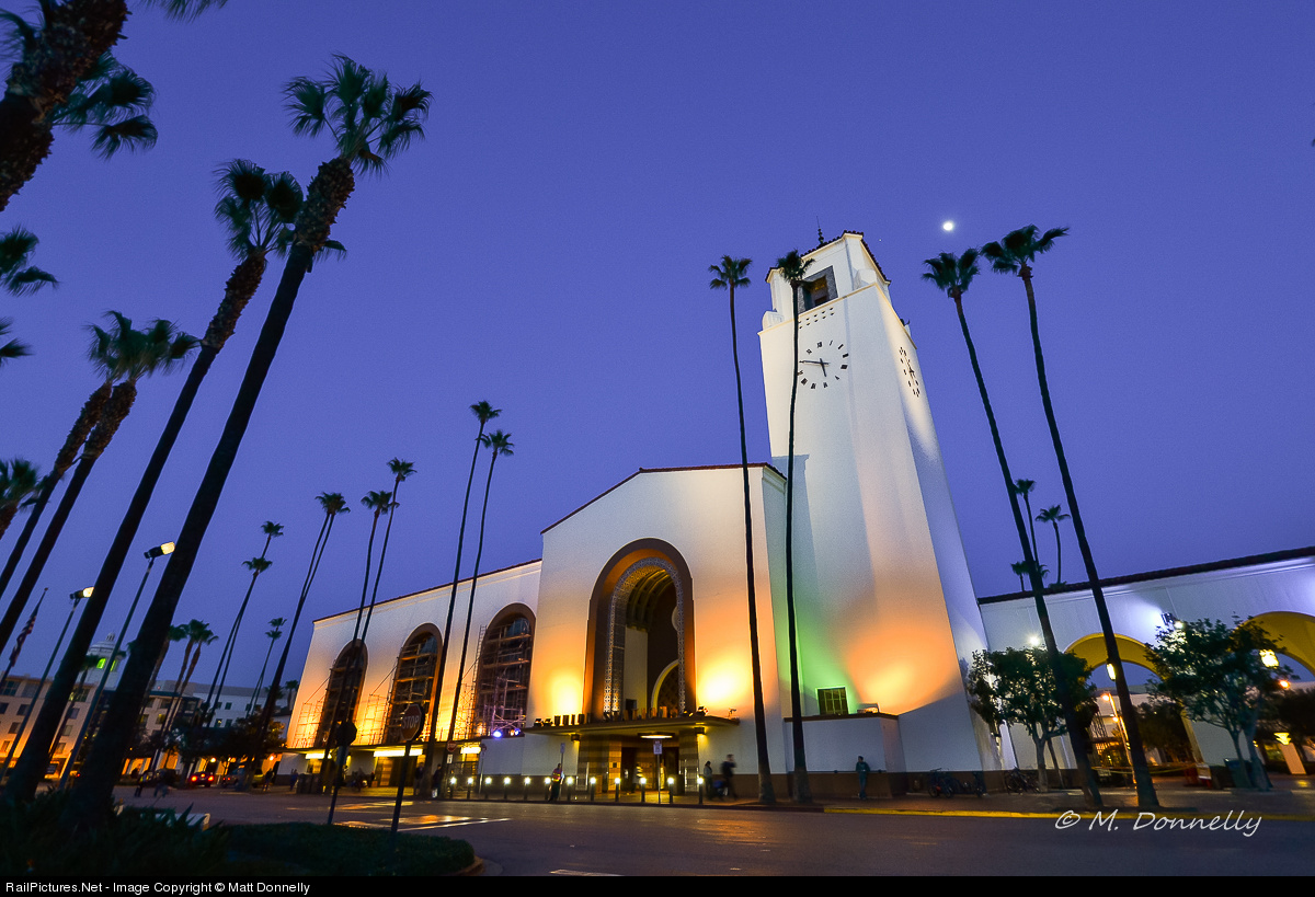 The moon rises over Los Angeles Union Station on a pleasant evening. A plaque inside reads "Union Station - 1939, Built in Spanish-colonial style on an Indian village and later Chinese town site by Southern Pacific, Santa Fe and Union Pacific Railroads."