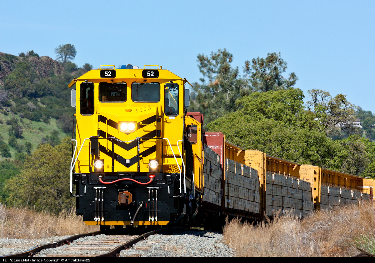 | On only its fourth revenue run after being built, Sierra Northern 52 leads the Sonora Local along the old rickety Oakdale Branch west of Jamestown, California. The rolling hills and variable grade test this new unit as it hauls a number of loaded lumber and ballast cars towards Chinese Camp. |