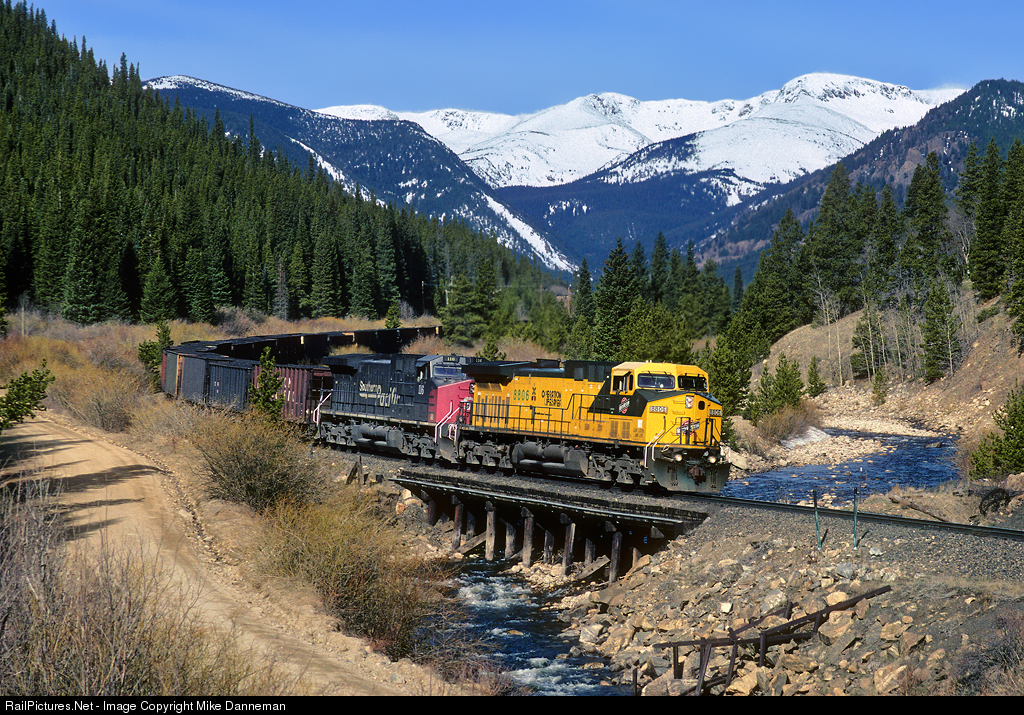 The Continental Divide is still cloaked in white on April 26, 2000, as an eastbound Union Pacific coal train descends out of Tolland Colorado. A pair of GE AC4400CWs lead the train, with Chicago and North Western No. 8806 and Southern Pacific No. 116 crossing a trestle over South Boulder Creek on UP’s Moffat Tunnel Subdivision.
