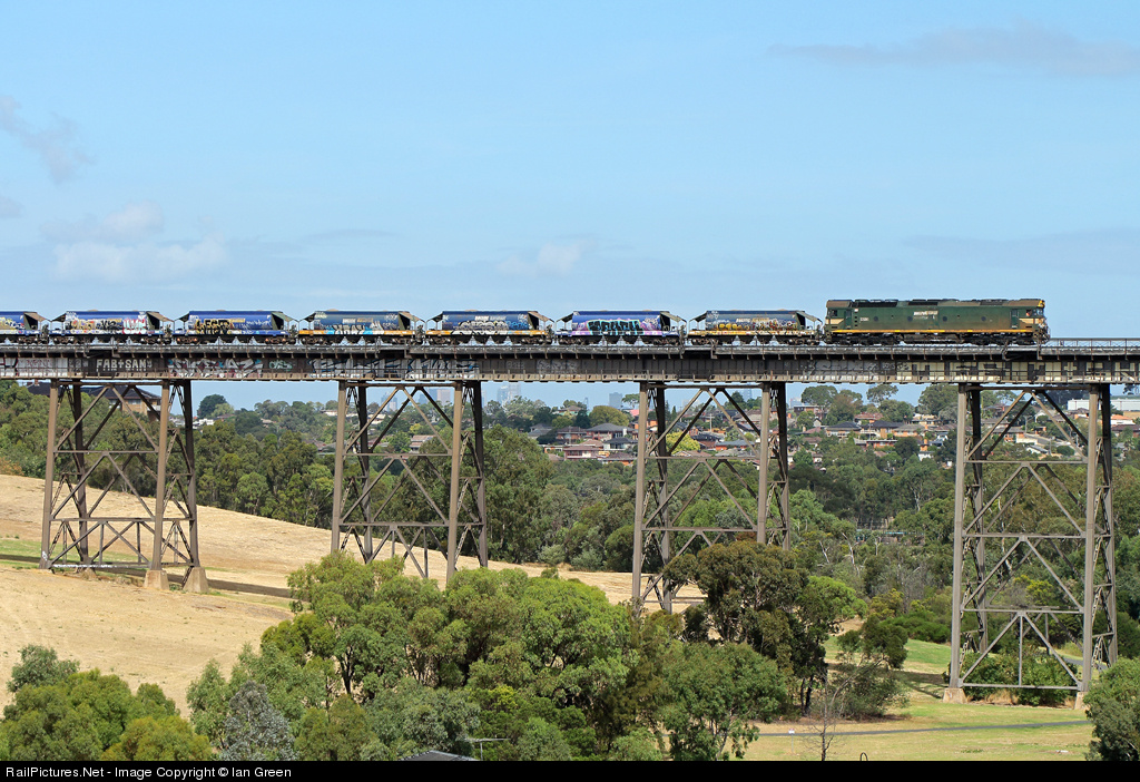 G528 eases 9318 up quarry freight from Kilmore East across the Moonee Ponds Creek viaduct near Glenroy.
