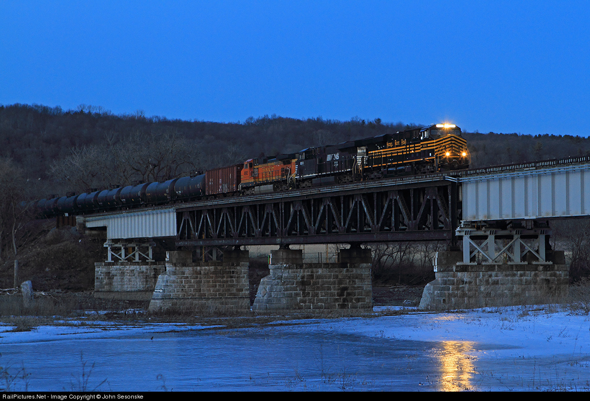 The lights of the NS Nickel Plate heritage reflect in an icy field at the blue hour as the NKP plus NS 8088 and BNSF 4992 lead 92 loads of oil and 2 buffer cars over the Mohawk River well after sunset...just a few days before Spring?