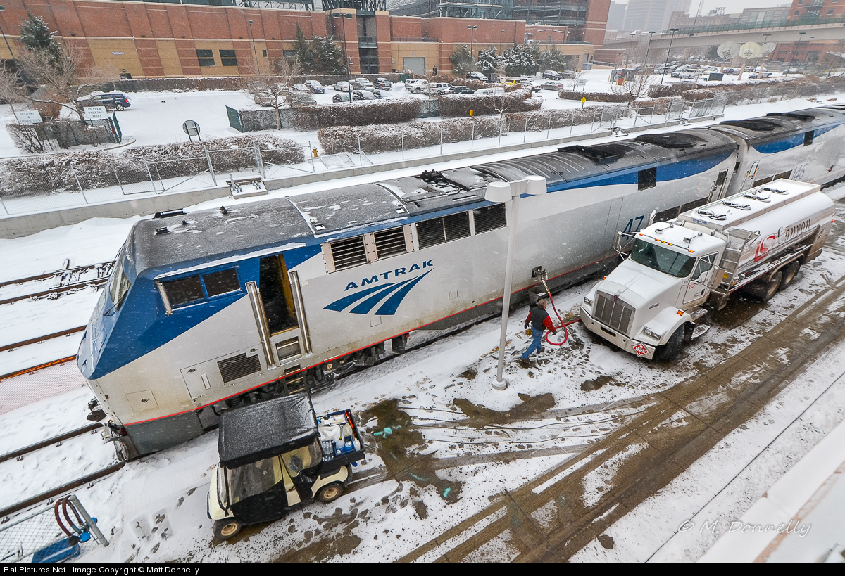 Now a thing of the past, the California Zephyr is stopped at the temporary Denver station and takes on fuel. The CZ recently returned to Union Station. It had been at a temporary station due to major renovations doing on at the normal stop.