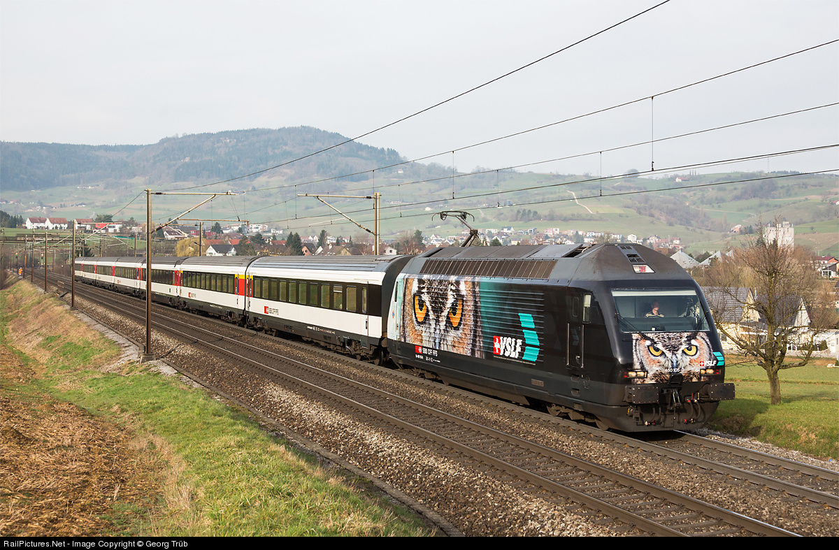| Re 460 105 "The Owl" with publicity paint scheme for VSLF (association of swiss train drivers and aspirants) is pulling Interregio 1963 from Basel to Zürich on the Bözberg line near Frick. |