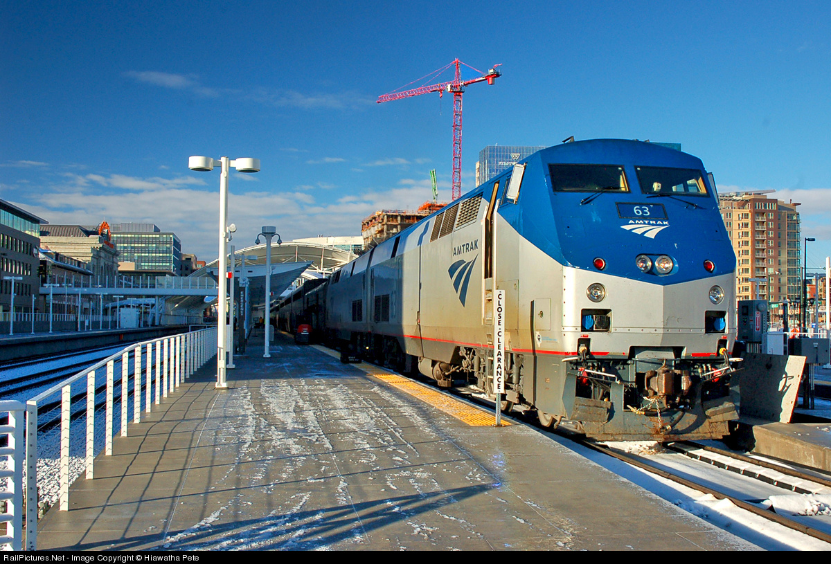 The westbound 'California Zephyr', with Amtrak P42DC #63 on the point, stands at the newly renovated Denver Union station. My wife & I rode this train as part of a trip from Buffalo to Sacramento (on the 'Lakeshore Limited' & 'California Zephyr') to visit the California State Railroad Museum, before continuing on to visit LA (on the 'Coast Starlight'), and returning to Buffalo (on the 'Southwest Chief' & 'Lakeshore Limited'). Taken with permission. For more pics & videos from this trip see my website at http://northamericabyrail.info/california-state-railroad-museum/