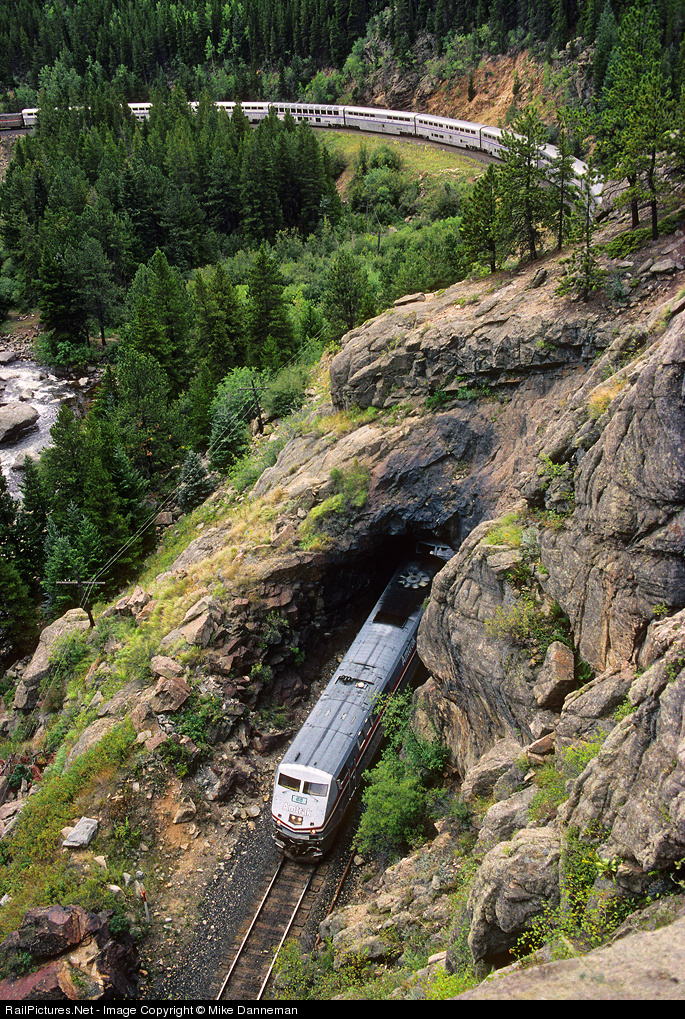 | Amtrak No. 5, the California Zephyr, slices through short Tunnel 29 just east of Pinecliffe, Colorado, on August 28, 2000. |