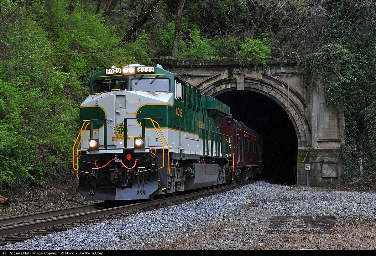 "Southern" 8099 exits the tunnel portal at "North Tunnel", underneath Chattanooga's Lookout Mountain. The heritage ES44AC led today's "21st Century Steam" excursion from the Tennessee Valley Railroad Museum in Chattanooga to Attalla, Alabama, and back. Photo by Casey Thomason. For more information about Norfolk Southern, visit www.nscorp.com