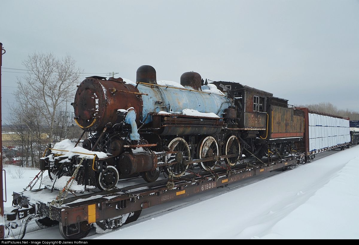 | A Very rare sight. T&NO/Normetal/ONT 4-6-0 #219 built in 1907, rides the rails once again. Not on her own wheels or under her own strength mind you, however the poor old relic of a proud era of railroading is heading to a new home where she will undergo static restoration and possible examination for running condition into the future. She will finish her ride on home rails, before heading west on the Ottawa Valley and North on CN to the Northern Ontario Railroad Museum and Heritage Centre in Capreol Ontario. |