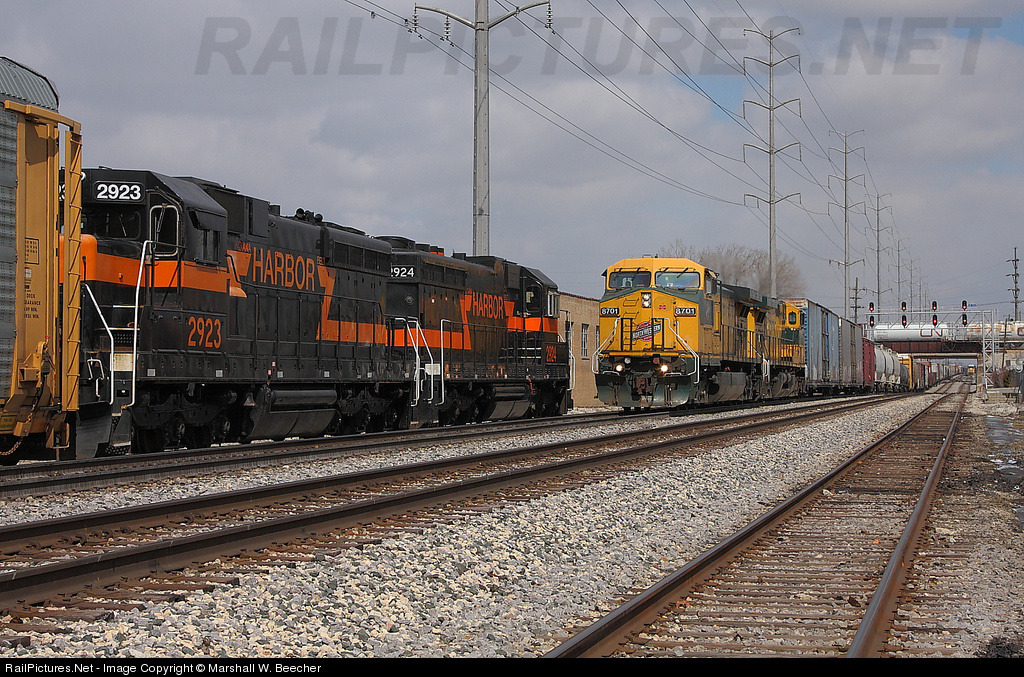 Vintage Chicago area transfer power meets head to head on IHB's often-busy multiple track beltline. A pair of aging IHB SD20's with autos for Canadian Pacific complete the scene.