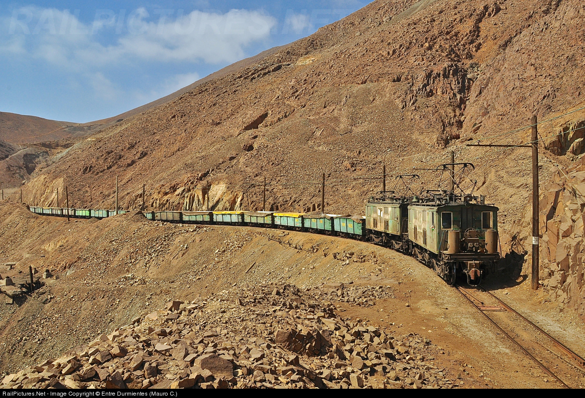 | Old GE Boxcab 289A electric locomotives, are still working for the hard Tocopilla - Barriles railway line, on the photo going up to barrels through the area of "Carmelita", Barriles ravine. |