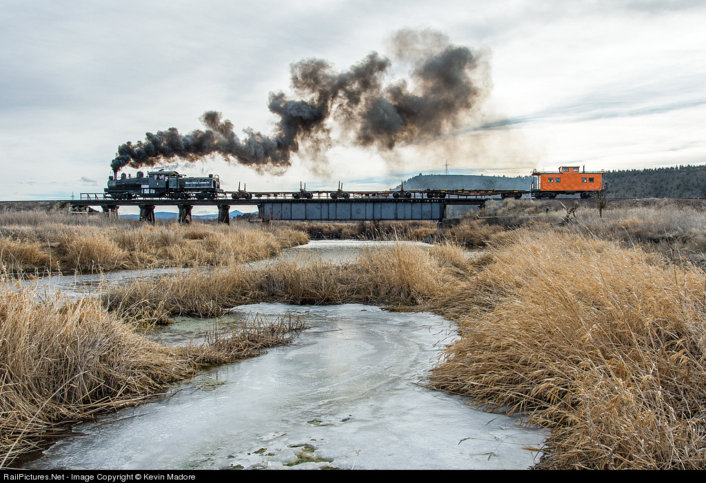 | Shuttling Timber. After dropping a load of fresh timber at a nearby sawmill, Mt. Emily Shay #1 crosses the Crooked River with her string of empty log bunks, headed back to the high country. |