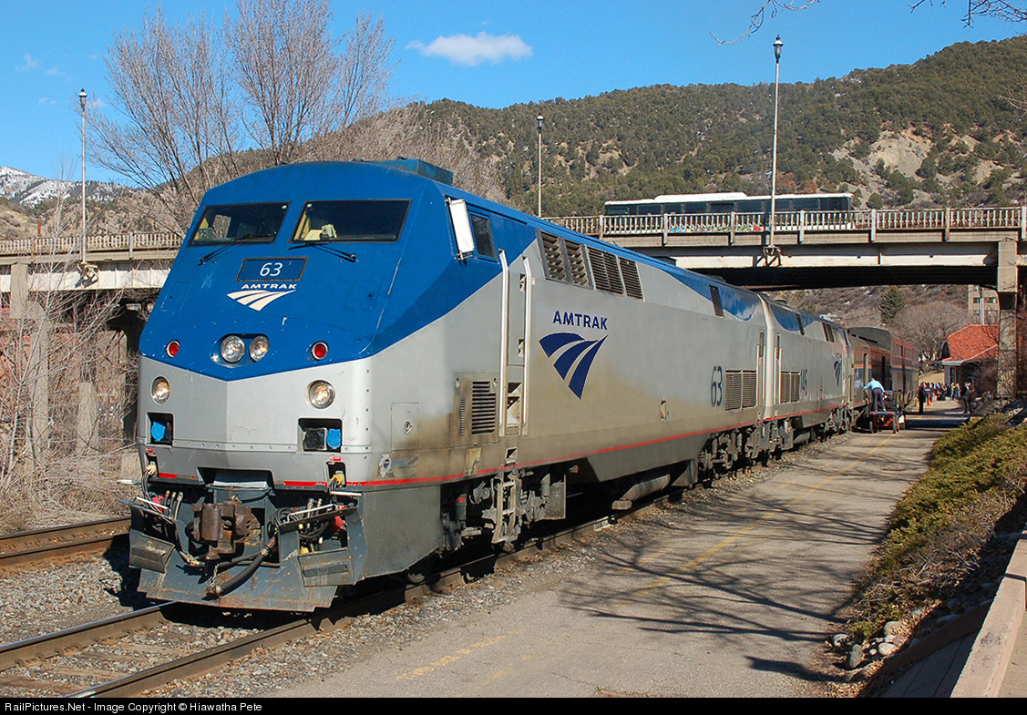 The westbound 'California Zephyr', with Amtrak P42DC #63 on the point, stands at Glenwood Springs Amtrak station. My wife & I rode this train as part of a trip from Buffalo to Sacramento (on the 'Lakeshore Limited' & 'California Zephyr') to visit the California State Railroad Museum, before continuing on to visit LA (on the 'Coast Starlight'), and returning to Buffalo (on the 'Southwest Chief' & 'Lakeshore Limited'). For more pics & videos from this trip see my website at http://northamericabyrail.info/california-state-railroad-museum/