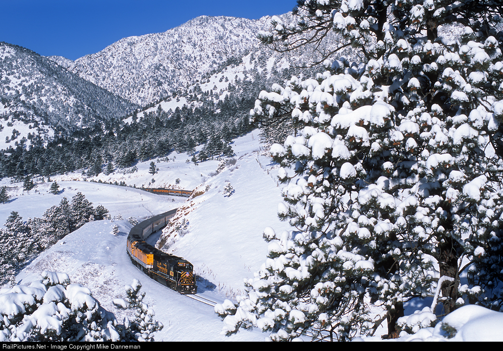 The Rio Grande Ski Train of March 2, 2002, has some “heritage” leading as it approaches Tunnel 1 east of Plainview, Colorado. Union Pacific EMD GP60 No. 1900, the former Rio Grande No. 3154, takes the place of the usual leading Ansco F40PH No. 242 that needed some shop time. Coal Creek Canyon is covered in a nice coat of white on this late winter morning—stuff that skier’s dreams are made of.