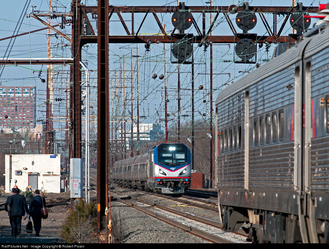 Rush Hour at Jersey Avenue An NJ Transit local pauses between runs at Jersey Avenue while Amtrak 129 rushes past with "Cities Sprinter" 602 leading. An off-duty crew can be seen walking toward the COUNTY interlocking "tower", perhaps the least-attractive tower on the Northeast Corridor. This utilitarian structure was built in the late 1940s as a combination yard office and interlocking tower. It replaced an earlier tower in the same vicinity that was torn down when the adjacent yard was built (out of sight at left). COUNTY was closed around 1990, but the four track crossovers remain in place, now remotely controlled. The track that can be seen diverging off the NYP main is the Millstone Branch which serves both NJ Transit's Jersey Ave. station and a small number of Conrail freight customers. |