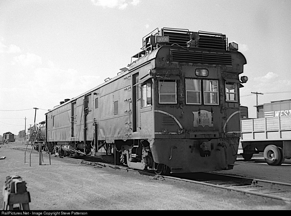 | Rock Island rebuilt motor car 9090 into a self-propelled weed sprayer; note the booms on the side that swing out. It was photographed with its tank car of herbicide at Topeka, Kansas |