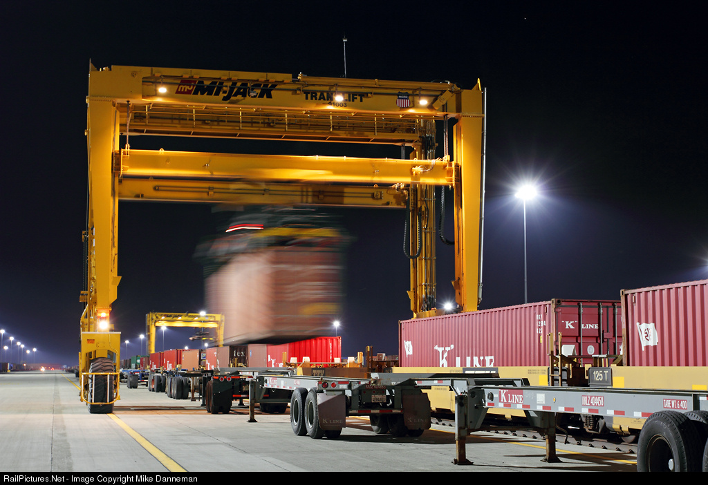 Union Pacific Mi-Jack No. 91003 loads a container into a well car at Joliet Intermodal Terminal (also known as Global IV) at Joliet, Illinois, on the night of November 9, 2010.