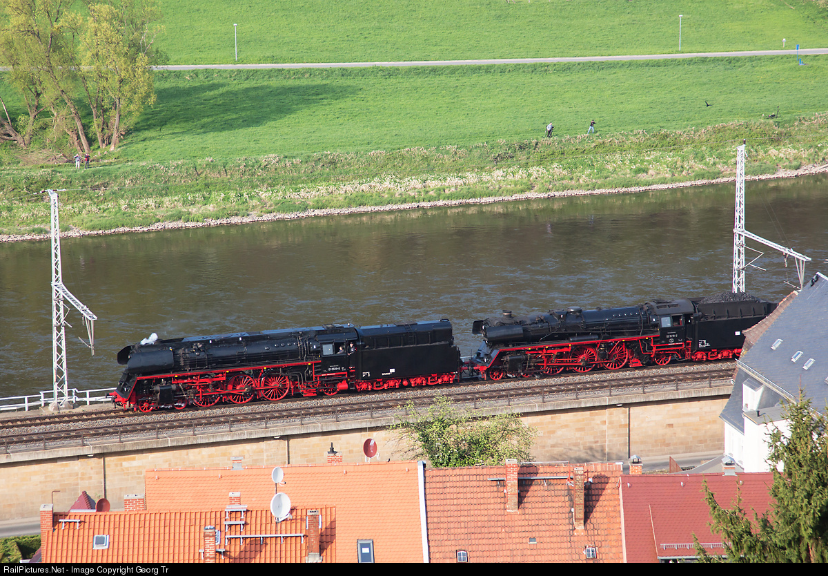 Two steam racehorses of the former Deutsche Reichsbahn of German Democratic Republic (GDR) are rolling along the Elbe river in Königstein with a train from Decin to Dresden on the occasion of the steamlocomotive meeting 2014 in Dresden. Leading is 01 0509 of the famous "01.5" series, reconstructed in the 1960' from former 01 series with new boilers, new cylinders, new cab, cladding of the domes etc. Oil fired 01 0509 is running for the Eisenbahn-Bau- und Betriebsgesellschaft Pressnitztalbahn mbH (PRESS) since 2010 and can reach 130 km/h.