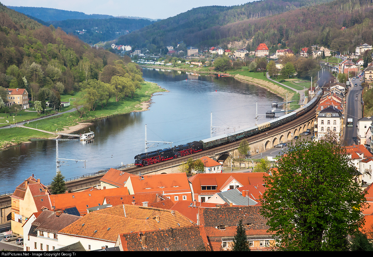 Two steam racehorses of the former Deutsche Reichsbahn of German Democratic Republic (GDR) are pulling a long 15 cars train from Decin to Dresden along the Elbe river in Königstein on the occasion of the steamlocomotive meeting 2014 in Dresden. Leading is 01 0509 of the famous "01.5" series, reconstructed in the 1960' from former 01 series with new boilers, new cylinders, new cab, cladding of the domes etc. Oilfired 01 0509 is running for the Eisenbahn-Bau- und Betriebsgesellschaft Pressnitztalbahn mbH (PRESS) since 2010 and can reach 130 km/h.