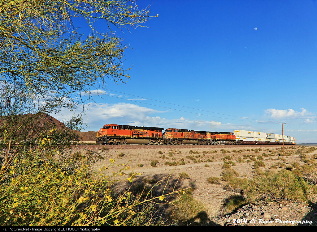Palo Verde at Siberia - Spring in the Mojave brings the blooming off the Palo Verde plants (the yellow flower) and in some places they cover the desert floor like a forest. Here a fast internodal blasts through Siberia on it's way to Barstow under a nearly full moon.