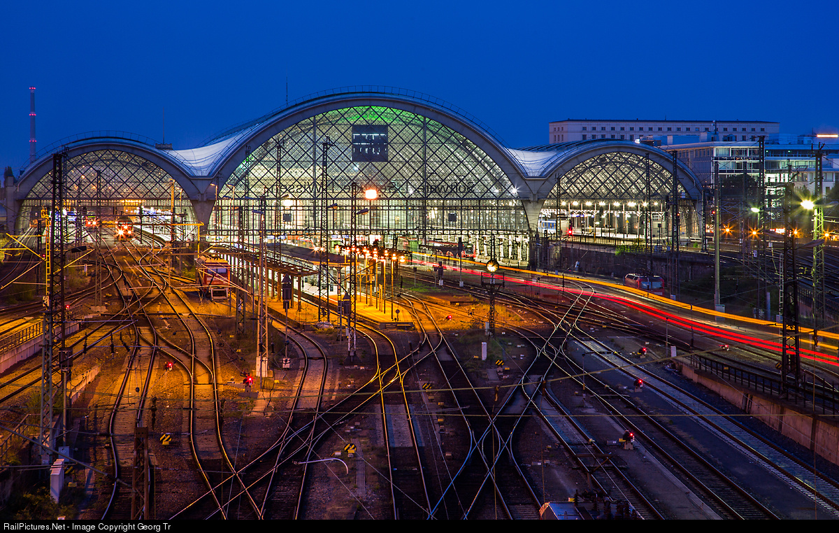 Dresden Hbf (main station) in the blue hour at 8.30 PM. Dresden main station is one of the most impressive german stations, with a large concourse with 7 stump tracks/platforms for starting and ending trains, flanked on both sides by elevated smaller concourses with 3 / 4 long through tracks each, plus two tracks outside on the south side for freight trains.