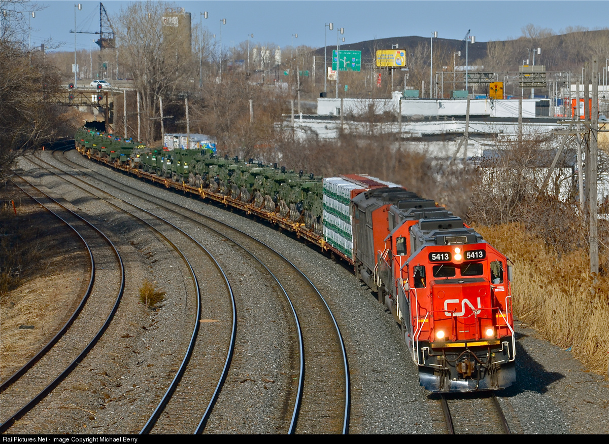 Triple SD60s and military equipment! CN 5413, CN 5542 and CN 5541 head west with CN 705 after a crew change at Turcot West. CN 705 is an empty oil train, though you can't tell from this shot! Ahead of the empty tank cars were a good 50 or so flat cars with military equipment destined for Wainwright, Alberta. For a view of the head end of this train, click here.