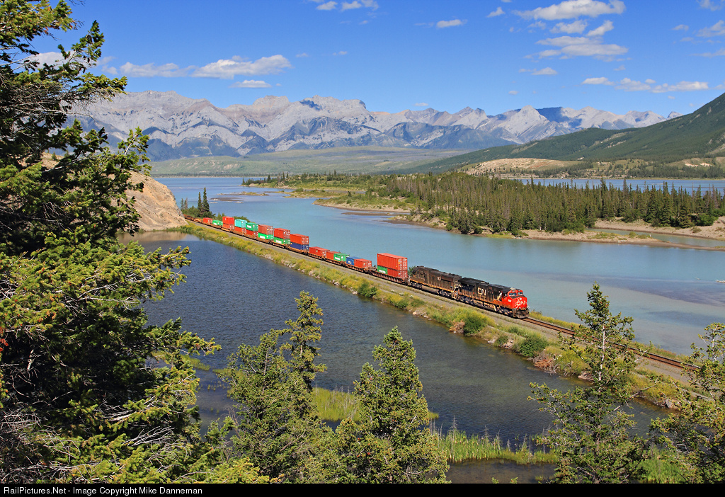 Canadian National train No. 111 passes Windy Point west of Devona, Alberta, on July 16, 2013, as it passes beautiful Jasper Lake and the rugged scenery in Jasper National Park.