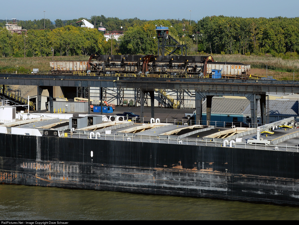 A view of the rotary dumper at CSX's Presque Isle coal dock in Toledo. Two loaded cars are entering the dumper on the right and in the process push two empty cars out the left side and down the grade into the empty yard. Neat operation to watch but it takes forever to load a ship given it is done two cars at a time.