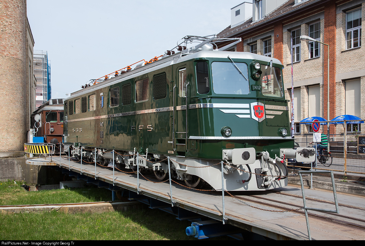 | Like fresh from the factory, locomotive Ae 6/6 # 11407 "Aargau" is standing on the turntable of the former Schweizerische Lokomotiv- und Maschinenfabrik Winterthur (SLM), where she was built in 1955. The operational classic Gotthard locomotive with 6000 HP is owned by SBB Historic, but on long term loan to association "Mikado 1244" in Brugg (AG). All the restauration back in the delivery state was done by people of "Mikado 1244". |