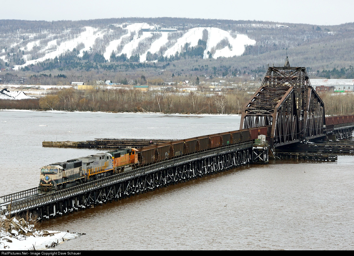 A loaded ore train interchanged with CN slowly crosses the former NP Grassy Point draw between Superior and Duluth. The Spirit Mountain ski hill can be seen in the distance.