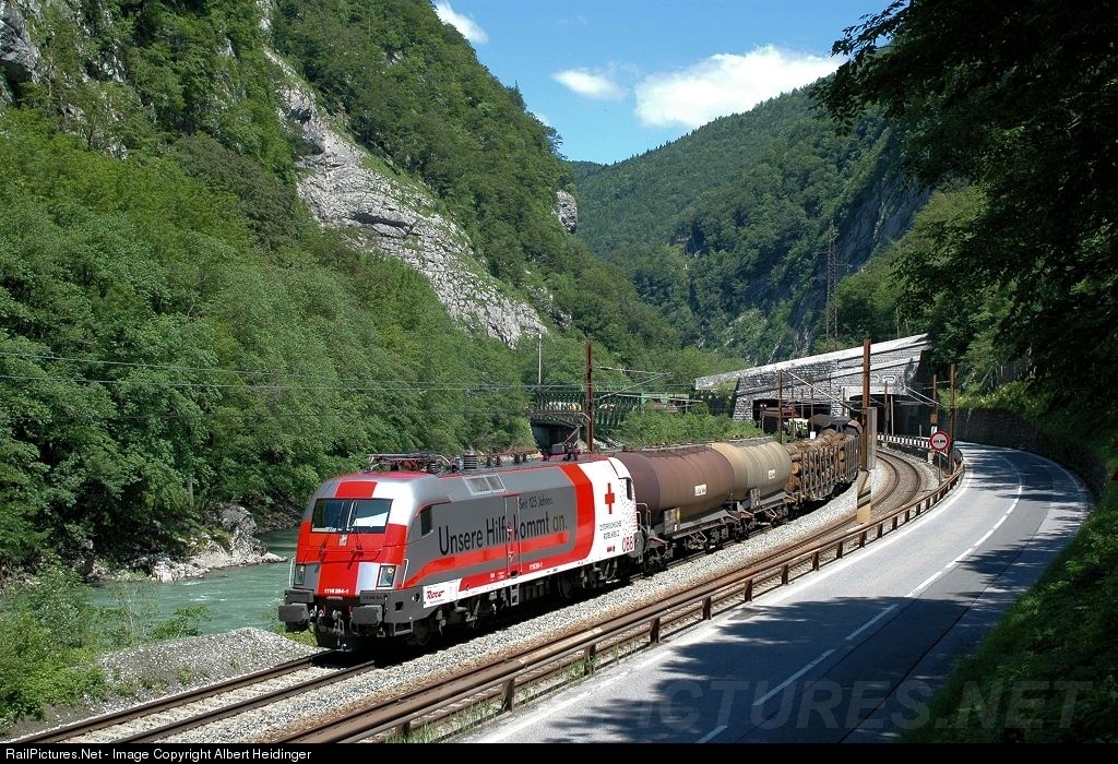 | South (railroad: west) of Salzburg the Austrian east-west mainline follows the valley of the Salzach River for about 100 kilometers. About 30 kilometers south of Salzburg the valley narrows to a deep canyon. The railway bypasses the most narrow part inside a tunnel and then follows the narrow river bank through the canyon. 1116 264 wearing a special livery for Austrian Red Cross on June 11, 2006, just exited this tunnel, crossed the river and passed a snow shed with its southbound mixed freight train. |