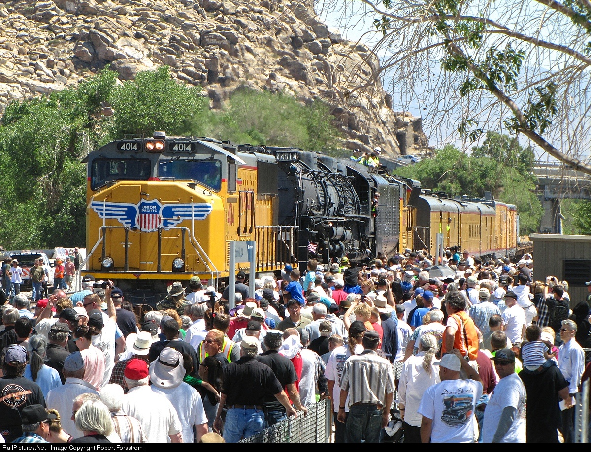 Hundreds of railfans young and old crowd around UP Big Boy #4014 and entourage after the special train makes it's scheduled stop at the Victorville, CA Amtrak station on BNSF's Cajon Sub. This one of a kind train is on it's way to Cheyenne, WY where UP steam crews hope to rebuild and restore the Big Boy to full operation within the next 4-5 years.