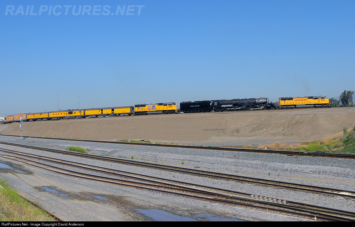 Union Pacific "Big Boy" 4014 is finally heading home to Cheyenne, Wyoming to be restored to operable condition. Train PWCYR2 28 (Passenger, West Colton Yard CA to Yermo CA) is departing West Colton Yard in Bloomington, California a little over an hour late. Rounding the West leg of the Mojave Wye is UP SD70M 4014, 4-8-8-4 4014, SD70M 4884, three passenger cars, two box cars and seven flat cars (6 loads, 6 empties, 694 tons and 820 feet).