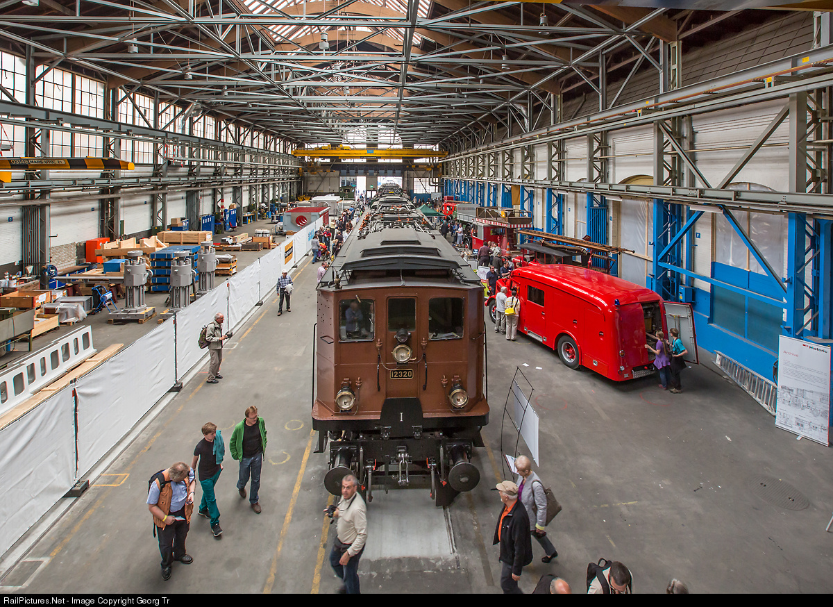 View in the large assembly hall from 1918 of the former Swiss Locomotive and Machine Works (SLM), on the occasion of an exhibition for clebrating 750 years town privileg of Winterthur. In the middle Gotthard passenger trains locomotive Be 4/6 # 12320 from 1921 (SBB Historic), behind not really visible Crocodile Be 6/8 III # 13302 and Ae 4/7 # 11026. On the right some historic firefighter cars. The left part of the hall is rented to Burckhardt Compression AG.