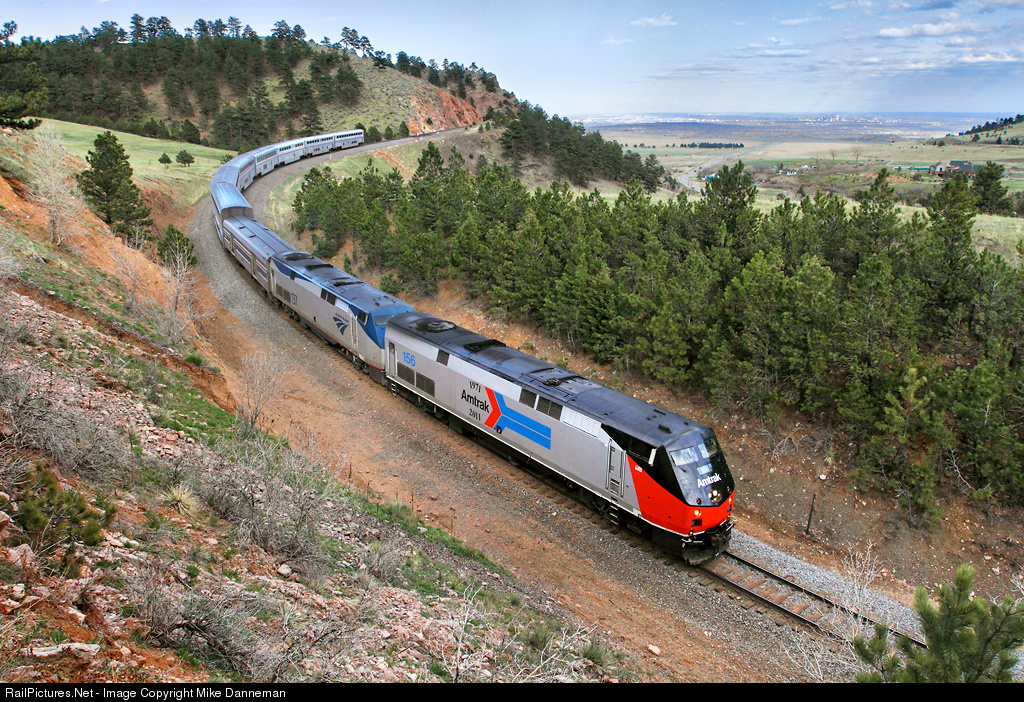 Amtrak No. 6, the eastbound California Zephyr, drops downgrade out of Tunnel 1 and crosses the mouth of Coal Creek Canyon east of Plain, Colorado, on the afternoon of April 30, 2014. The city of Denver and eastern plains can be seen in the background.