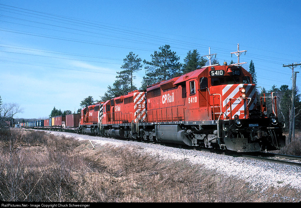 | Hot CPR Schiller Park-St. Luc run-through has detoured off it's usual path over CSX across Lower Michigan. Here it is blasting out of Trout Lake on the WC with ex QNSL 5410 leading 5526, 6044 and 39 cars of COFC toward the Sault Ste. Marie gateway. |