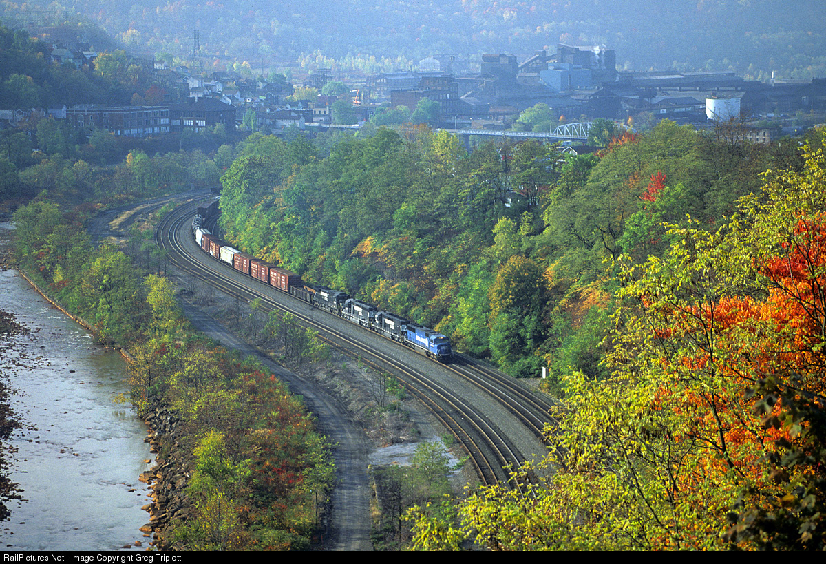 A colourful Conrail unit leads 3 Norfolk Southerns upgrade from Conemaugh. Relics of the former steel industry form the backdrop