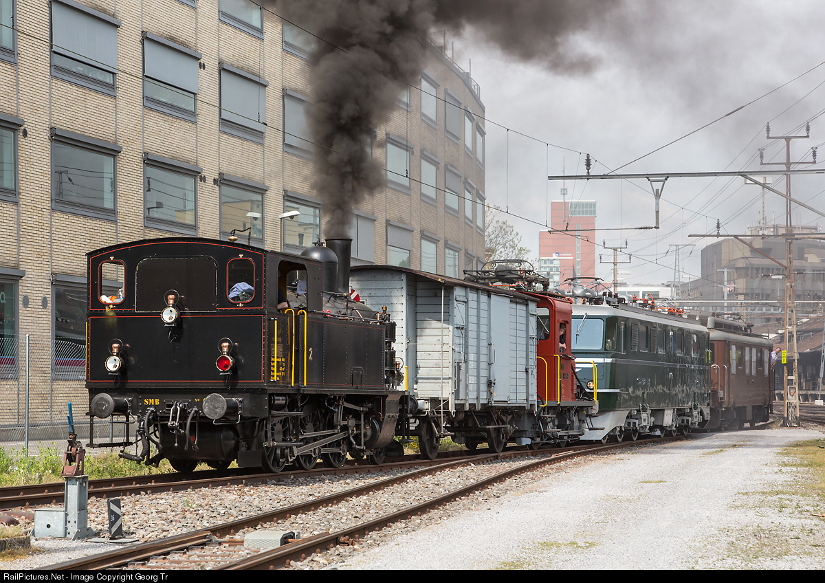 Steamlocomotive Ed 3/4 # 2 (former Solothurn-Münster-Bahn SMB) of the Verein Historische Eisenbahn Emmental (VHE) is pulling a load of more then 220 tons up the connecting track from Winterthur station to the former Swiss Locomotive and Machine Works area. Behind the grey freight car electric shunter Te III # 130 of DSF, then Ae 6/6 # 11407 of association Mikado 1244 and Ae 4/4 # 251 of association Extrazug.ch.