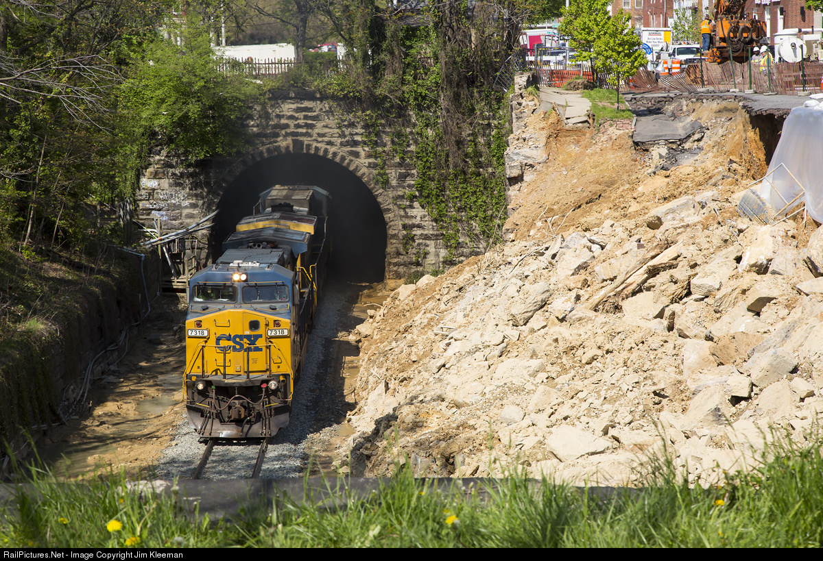An eastbound CSX train moves past the site of a roadway collapse in Baltimore, MD. During a torrential rain that reached a total of 6-7 inches over a few hours in some locations, 26th St collapsed onto the CSX mainline. About a dozen cars, the side walk, a good portion of the roadway, and a retaining wall ended up on the tracks. While the railroad was back in business a little more than 24 hours after the event, local residents may be out of their homes for up to eight weeks while the city makes repairs to their street
