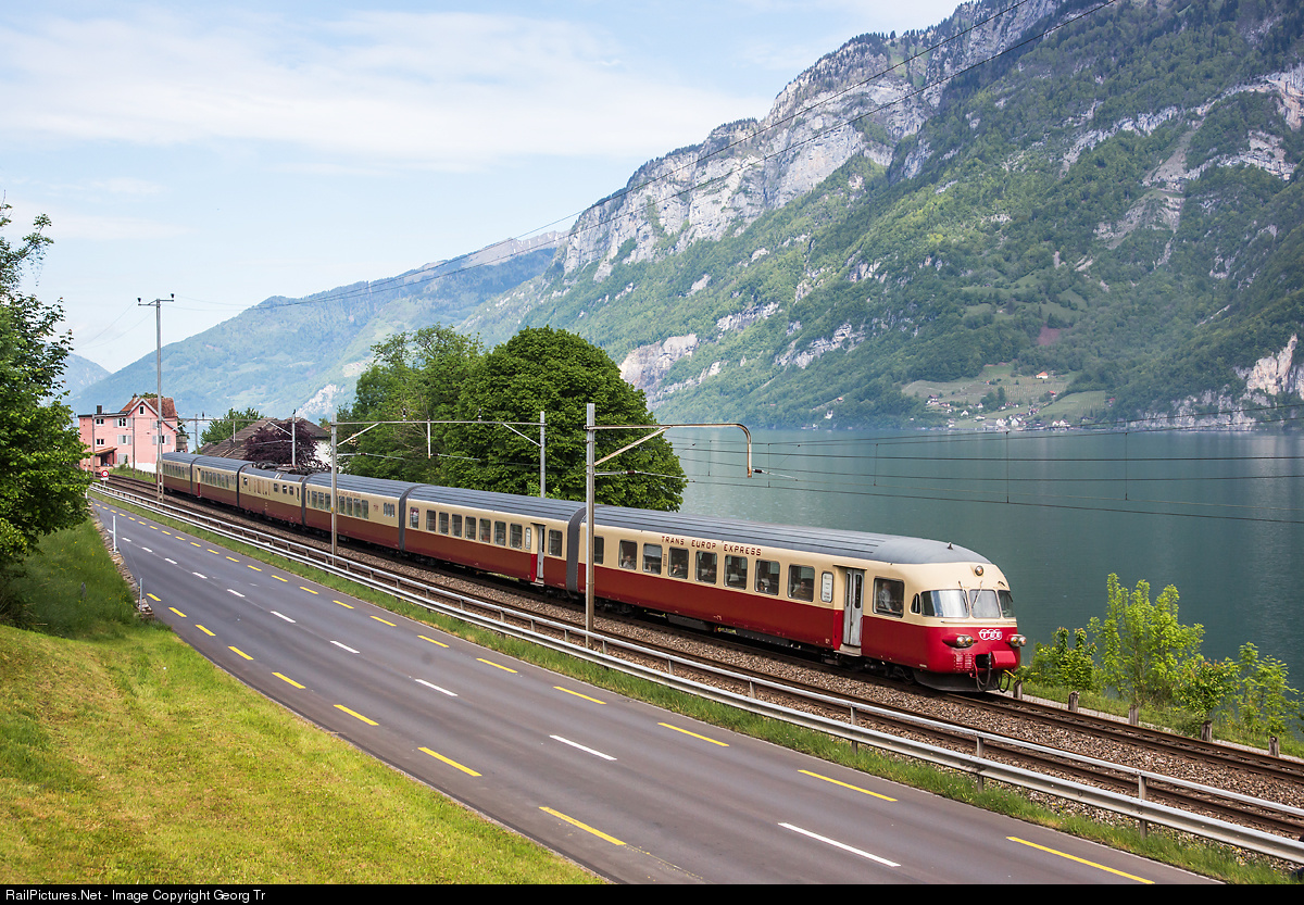 The elegant RAe TEE II trainset # 1053 of SBB Historic, built in 1961 and capable for the 4 different electric power systems of the europeen railways, made a journey from Olten to Landquart on the occasion of the open doors event in the RhB rolling stock works. The train is rolling along the green Walensee between Weesen and Walenstadt on the line Zurich-Chur.