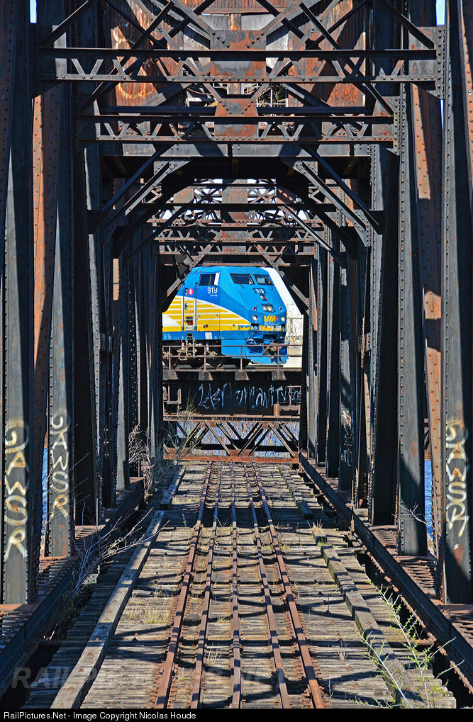 | Peek-a-boo! VIA #57 pass in front of "CN-Du Port" bridge on the CN Saint-Hyacinthe subdivision. The "CN-Du Port" bridge was built in 1912 by the Dominion Bridge for the Grand Trunk Railway, Canadian National ancestor. It's now belongs to Parks Canada. As it was no longer functional and was too low for the return of the boats, it was rotated on its central island. This is the only former swing bridge Lachine Canal to still have the cab which made the bridge operator to operate the mechanism. |
