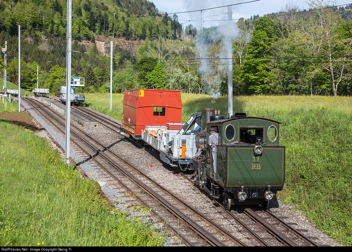 | Extensive maneuvers in Kräbel station with cogwheel steamlocomotive H 2/3 # 17 of the Rigibahnen. Two of the total 5 service cars had to be brought down to Goldau, the other stayed in Kräbel for the moment. The line was interrupted for passenger traffic for several days because of rock blasting works in the Kräbel rock face. |