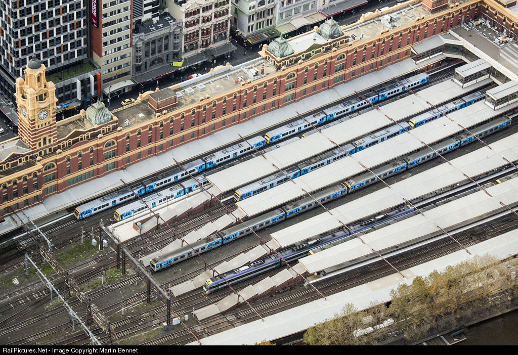 Flinders Street Station on a Tuesday afternoon sees most platforms occupied by a variety of suburban trains, as well as a VLocity DMU arriving into platform 7 with a regional service to Traralgon. Photographed from the 88th floor of the Eureka Tower.