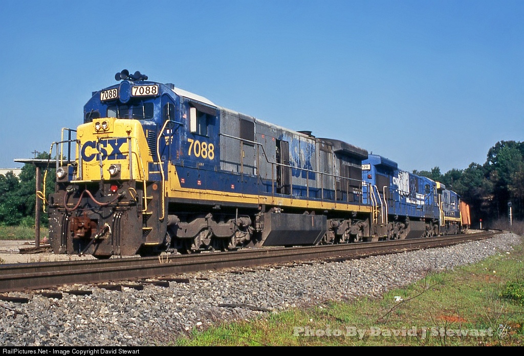 | CSX C30-7 7088 and it's sisters by this time have been demoted to Ballast Train service. Seen in Manchester, Georgia waiting for a fresh crew, the 7088 will take this company service train to Martian Marietta in Junction City to be loaded. |