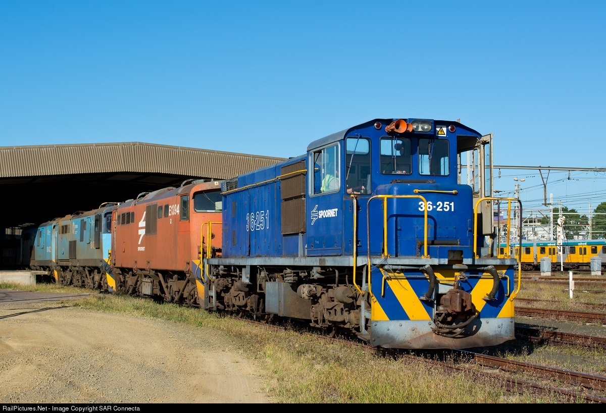 Shosholoza Meyl's Class 36 Diesel Shunter in Durban, 36-251, is hard at work moving two Class 18E units (PRASA "blue" livery) and Class 6E1 (Spoornet "orange" livery), E1394, into the shed for their routine inspections.