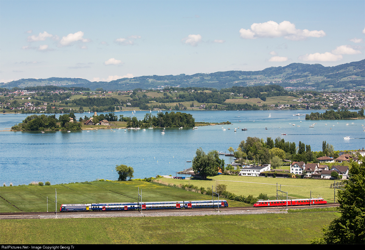 A doubledeck commuter push pull train (DPZ) with locomotive Re 450 is meeting the "Churchill Arrow" RAe 4/8 # 1021, built in 1939 and celebrating 75 years of operation in may 2014! In the background Lake Zürich and Ufenau (left) and Lützelau (right) island. Left from Lützelau you can see paddlesteamer "Stadt Rapperswil", celebrating 100 years of operation this month!