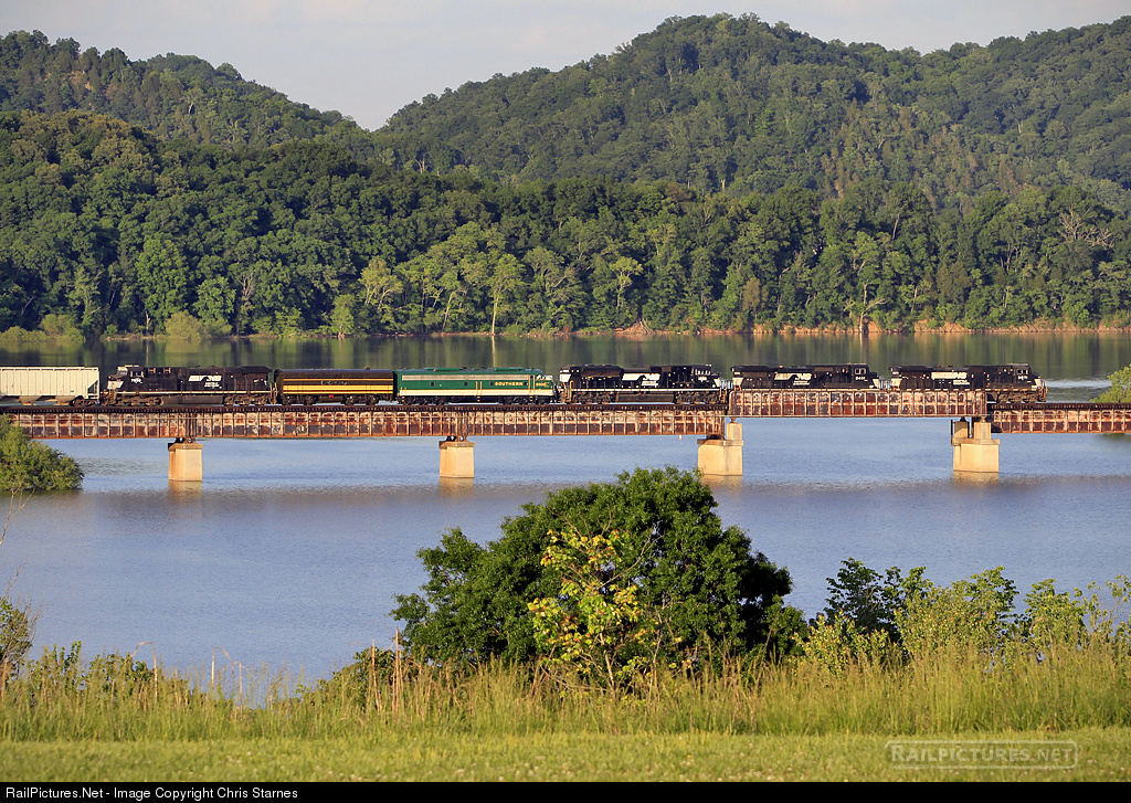 | Eastbound NS freight 162 crosses Douglas Lake at Leadvale, TN with Southern (North Carolina Transportation Museum) E8 #6900 and EMD FT-B #103 trailing as they make their trek from Chattanooga to Spencer for the upcoming Streamliners at Spencer special event. |