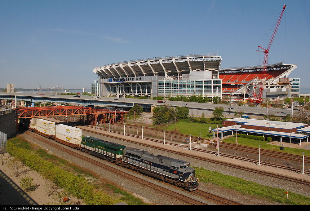The Wabash/Southern combo lead NS train 20R east as the pass in front of First Energy Stadium in downtown Cleveland.